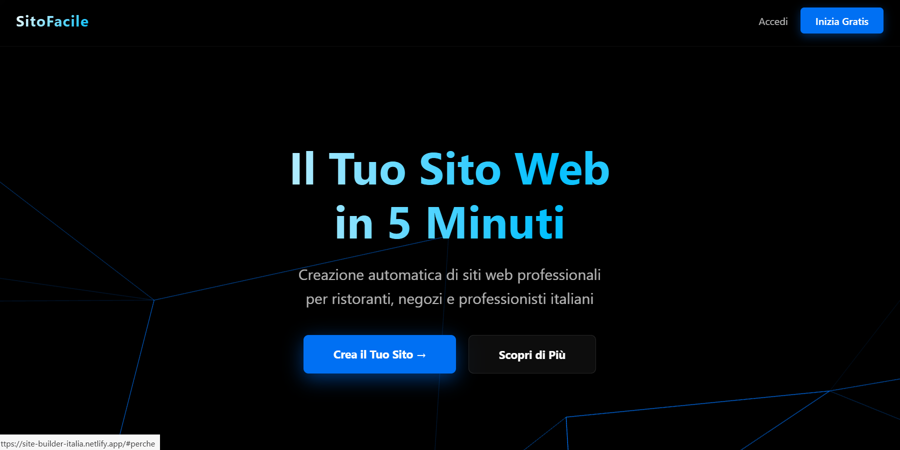 La nostra piattaforma SaaS per creare siti web professionali in pochi minuti. SitoFacile offre template personalizzabili, editor drag-and-drop intuitivo e hosting incluso. Perfetto per imprenditori, freelance e PMI che vogliono una presenza online immediata e professionale senza competenze tecniche.